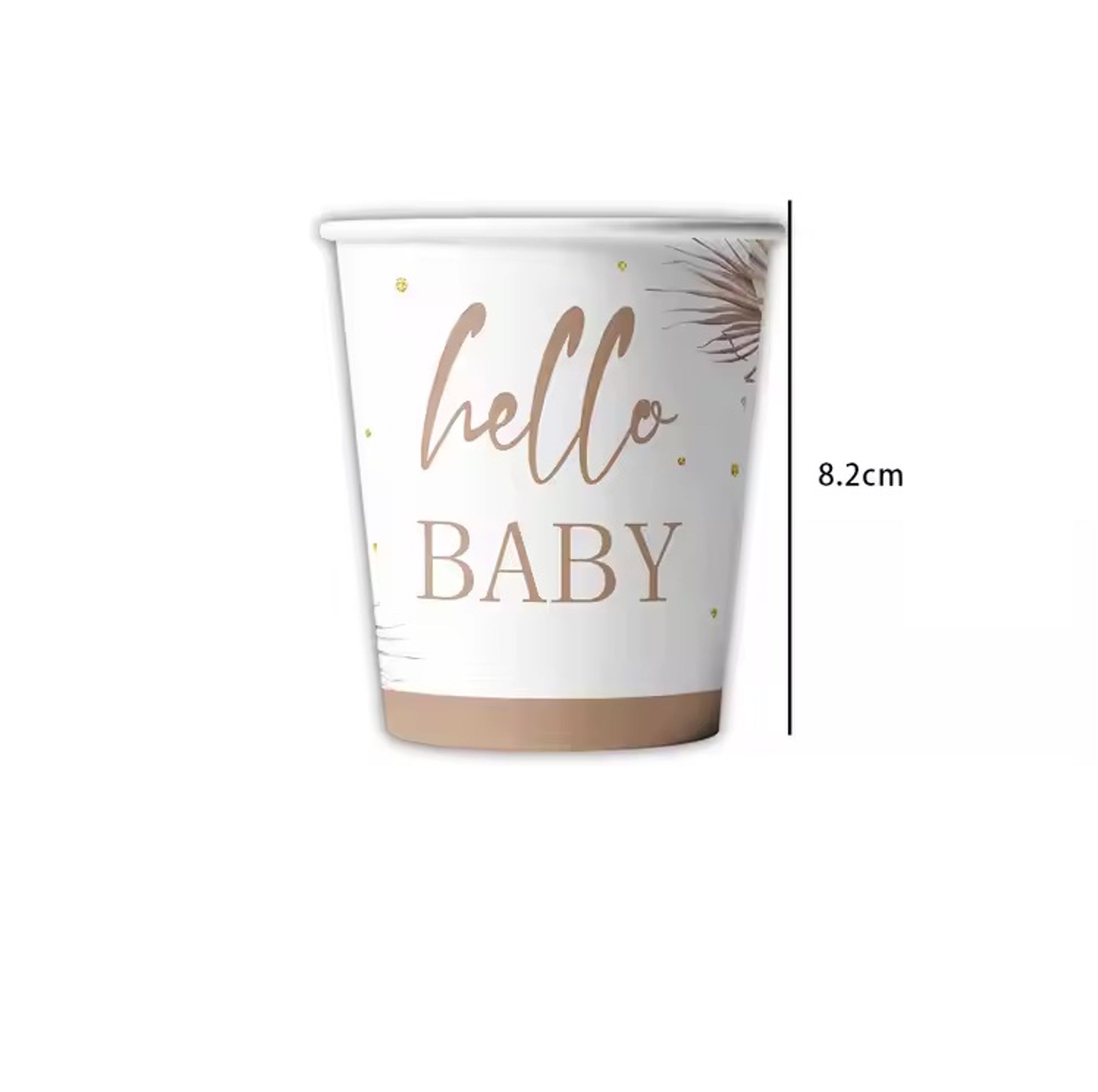 Tilføj et sødt og stilfuldt touch til din fest med disse fine papkrus med teksten "Hello Baby" – perfekte til babyshower, dåb eller den første fødselsdag.
