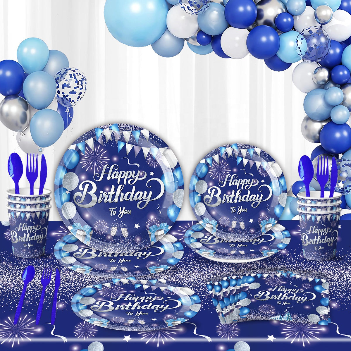 Kombinér med matchende tallerkener, servietter og pynt i samme blå og glitrende tema, og skab en fødselsdagsfest der stråler af glæde og farver.
