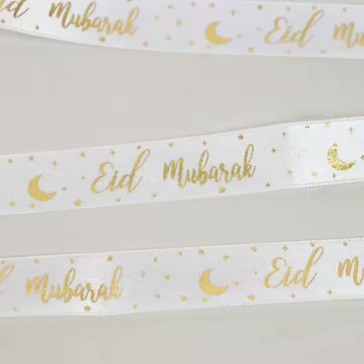 Forny din gaveindpakning med vores smukke Eid Mubarak gave bånd i hvid-guld! Dette elegante bånd tilføjer en luksuriøs og festlig detalje til dine gaver og skaber den perfekte præsentation til at fejre Eid.