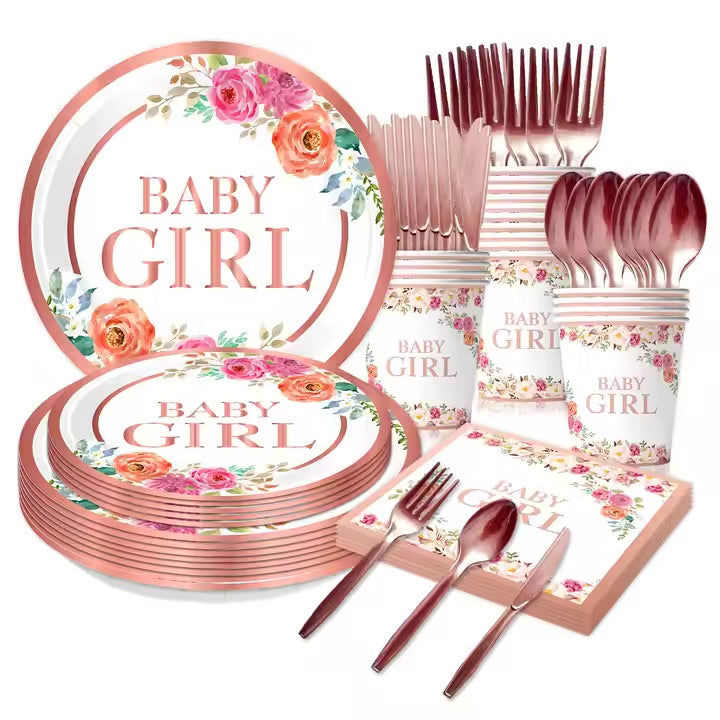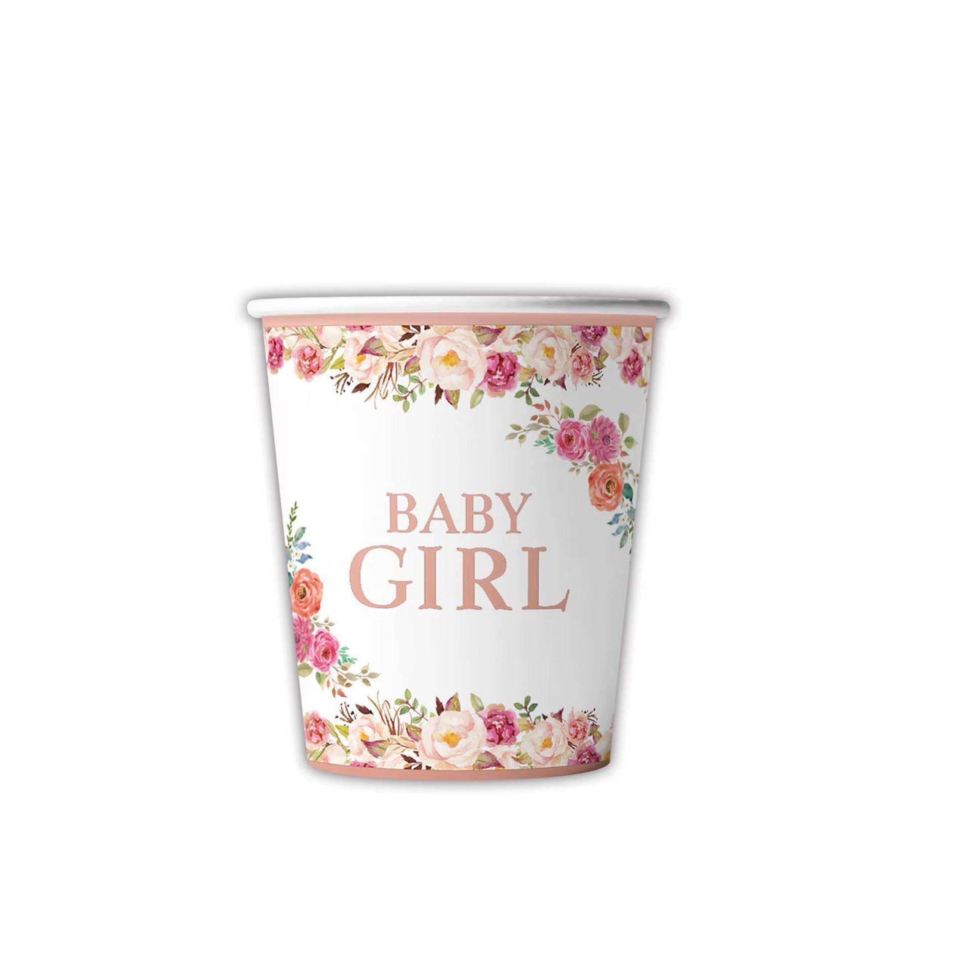 Tilføj et feminint og festligt touch til din fejring med disse yndige papkrus med teksten "Baby Girl". Krusene er dekoreret med en elegant roseguldkant og fine blomsterdetaljer – perfekte til babyshower, dåb eller en velkomstfest for den lille ny.
