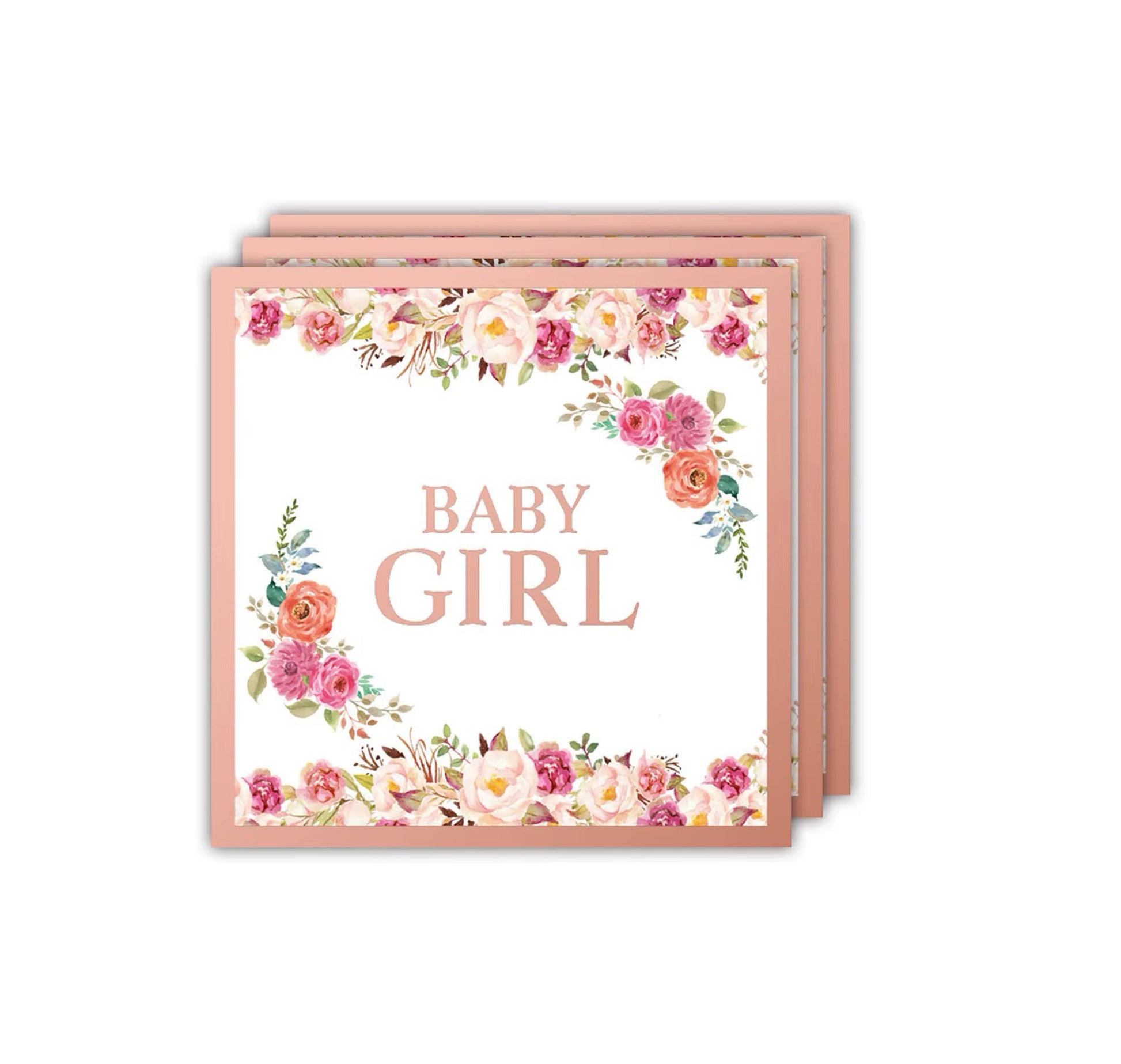 Gør din borddækning ekstra fin med disse smukke servietter med teksten "Baby Girl", pyntet med elegante blomsterdetaljer og en diskret roseguldkant. Perfekte til babyshower, barnedåb eller en sød velkomstfest for den lille pige.
