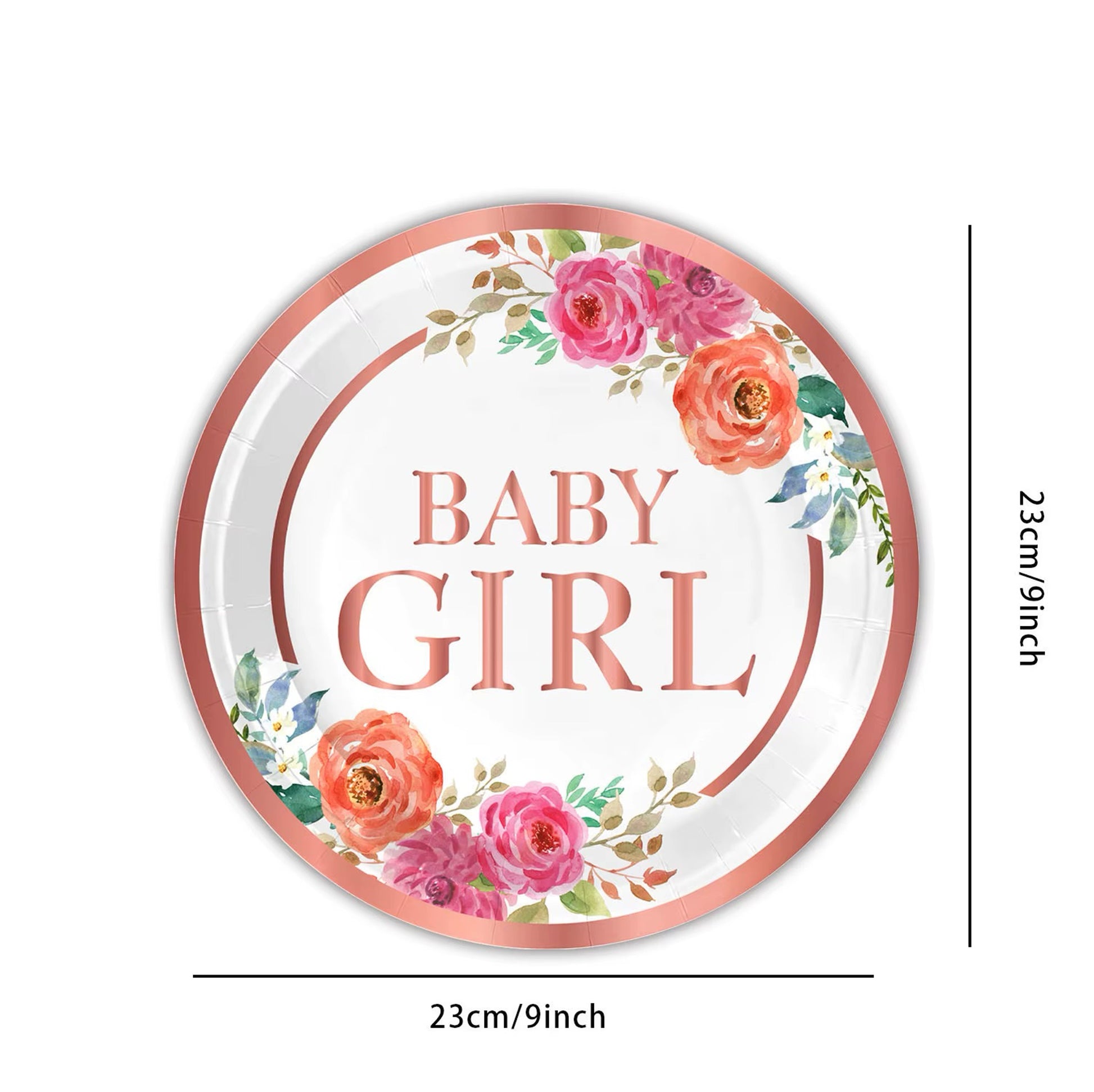 Fejr den lille prinsesses ankomst med disse smukke paptallerkener med teksten "Baby Girl" i midten. Tallerkenen er dekoreret med en fin roseguldkant og delikate blomster – perfekt til babyshower, dåb eller velkomstfest.
